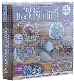 Rock painting set contains 6 Pebbles, 18 Paints 2 Brushes and instrutions 16CM X 16CM X 3CM