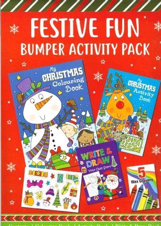 A4 Christmas activity pack. Contains an A4 colouring book with 32 pages, an A5 activity book with 36 pages, an A6 write and draw 24 page book, 1 sticker sheet and 5 wax crayons.