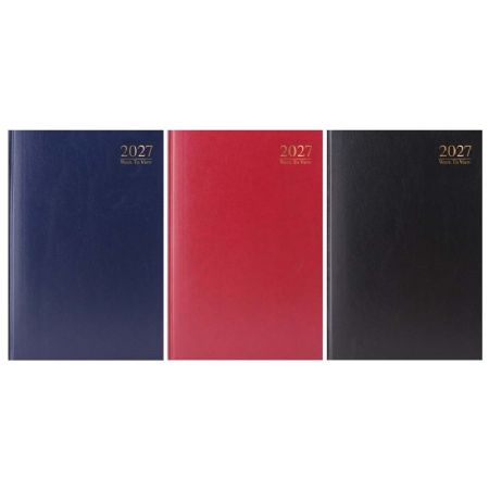 A4 week to view 2027 hardback diaries, supplied singly at random from the 3 colours shown. With ribbon page marker, address section, year planner, notable dates and religious festivals, weights and measures and financial notes sections.