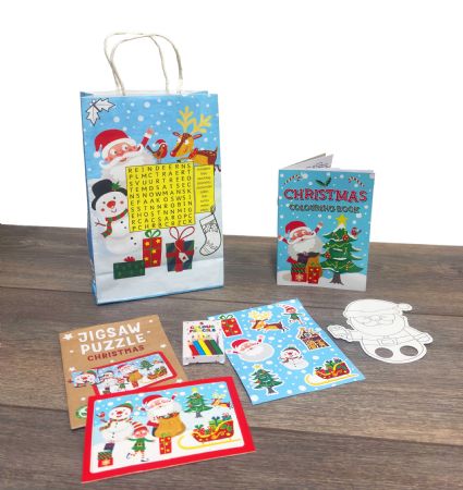Paper bag pre filled from Kidoodle! Each bag features paper twist handles and fun activities on all 4 sides meaning not only is each Kidoodle party bag plenty of fun, they're recyclable too!